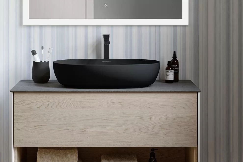 Все модели – накладные, предусматривающие отдельную установку смесителя. Обратите внимание, что для раковин PLAZA в комплект поставки входит чёрный донный клапан, делающий эстетику законченной. Также чёрная сантехника с донным клапаном есть и в новой коллекции Amaremare: там в тёмном исполнении доступны все три раковины из линейки Artbasins со структурированными стенками.