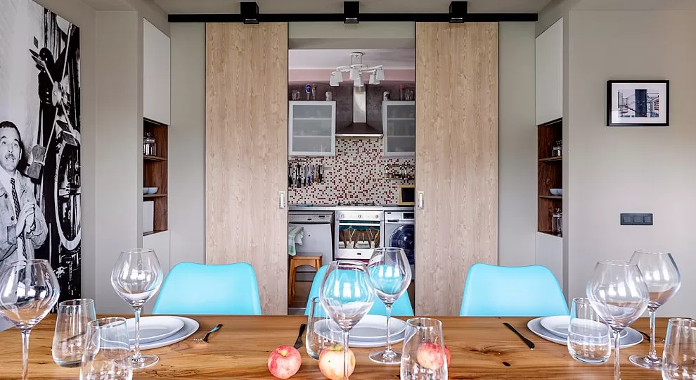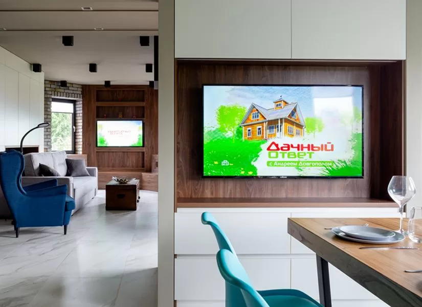 В своем проекте автор использовал беспроигрышный прием, позволяющий «связать» оба помещения воедино в рамках концепции «гостиная-столовая», — уложил на пол одинаковый керамический гранит «