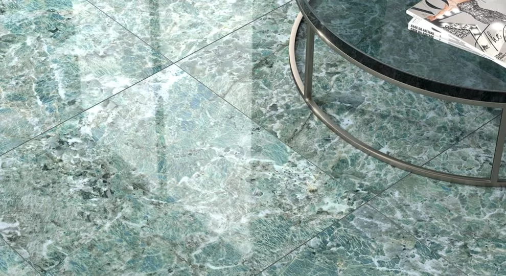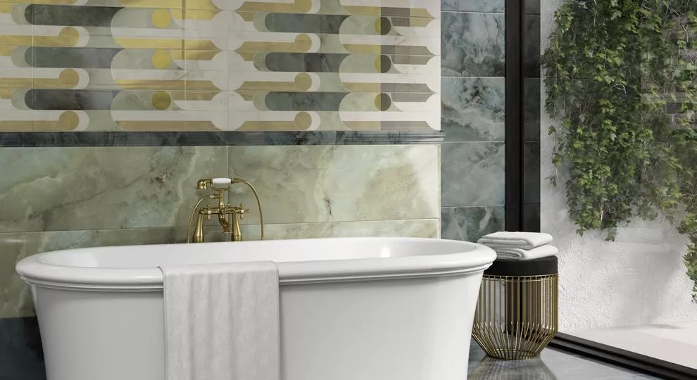 В коллекции MILANO дизайнеры KERAMA MARAZZI создали несколько серий, в которых нашла свое отражение красота оникса — в том числе в таких цветах, которые невозможно встретить в природе. Cерия настенной плитки «Джардини» сверхкрупного формата 40×120 решена в эстетике оникса в трех цветах — светло-бежевом, зеленом и синем. Украшением серии стал декор формата 20×120 с эффектом инкрустированного геометрического орнамента, подчеркнутого тонкими золотыми линиями: в нем завораживающие оттенки оникса соединены в стиле современного ар-деко. Для укладки на пол в ванной комнате предлагается лаппатированный керамический гранит в форматах 60×60.