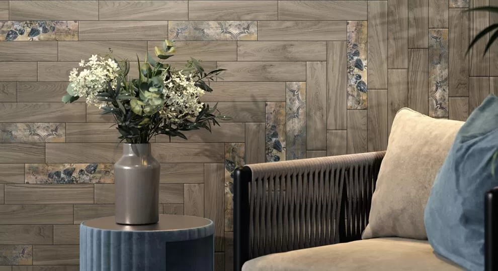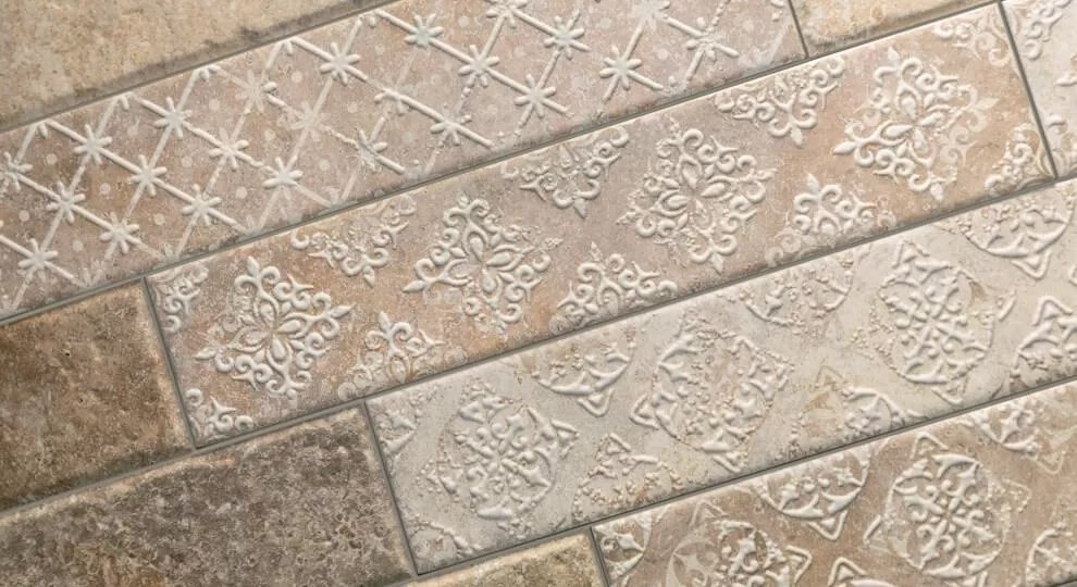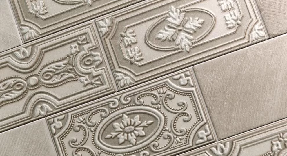 Еще одна универсальная серия — керамический гранит «Довиль» 9,9х40,2. Этот формат, похожий размерами на паркетную доску, выполнен в кирпичной стилистике и может использоваться и на полу, и на стене, и на открытом воздухе — для выкладки фасада, террасы, веранды или балкона. Кстати, декоры с эффектом антикварной керамики, представленные в серии, вместе с базовой плиткой можно использовать и на полу — даже на улице!