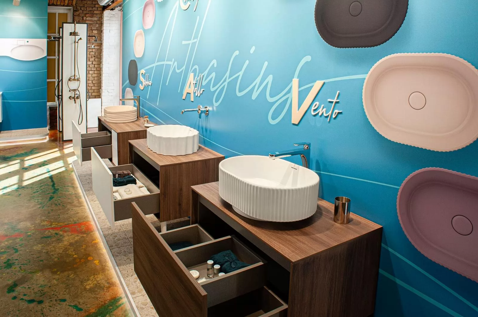 Отдельный зал выставки был посвящён новинкам для ванной комнаты. Прежде всего это коллекция сантеники-2021 Amaremare, вдохновение для которой наши дизайнеры черпали на побережье Адриатики. Раковины ARTBASIN со структурированными стенками, выполненные в природных расцветках, а также первая изогнутая раковина в ассортименте KERAMA MARAZZI, несомненно, стали одними из главных звёзд EXPO. Кроме того, в новых цветах были показаны уже полюбившиеся модели наших раковин.