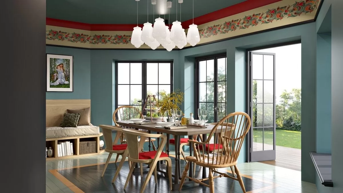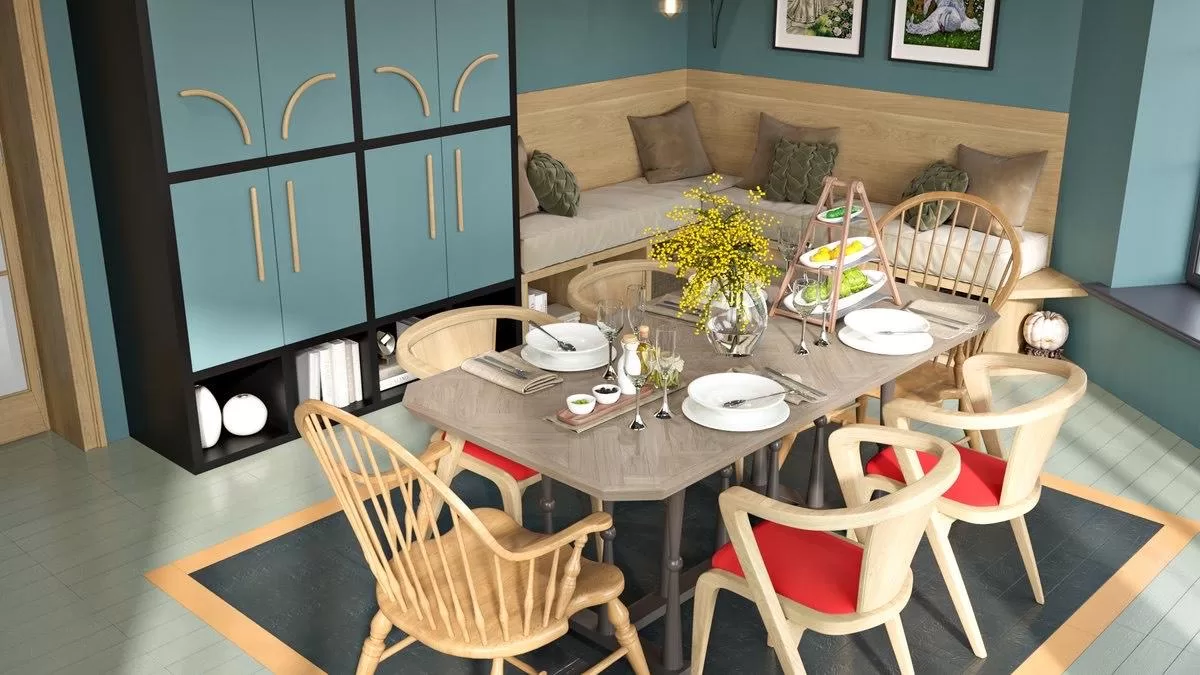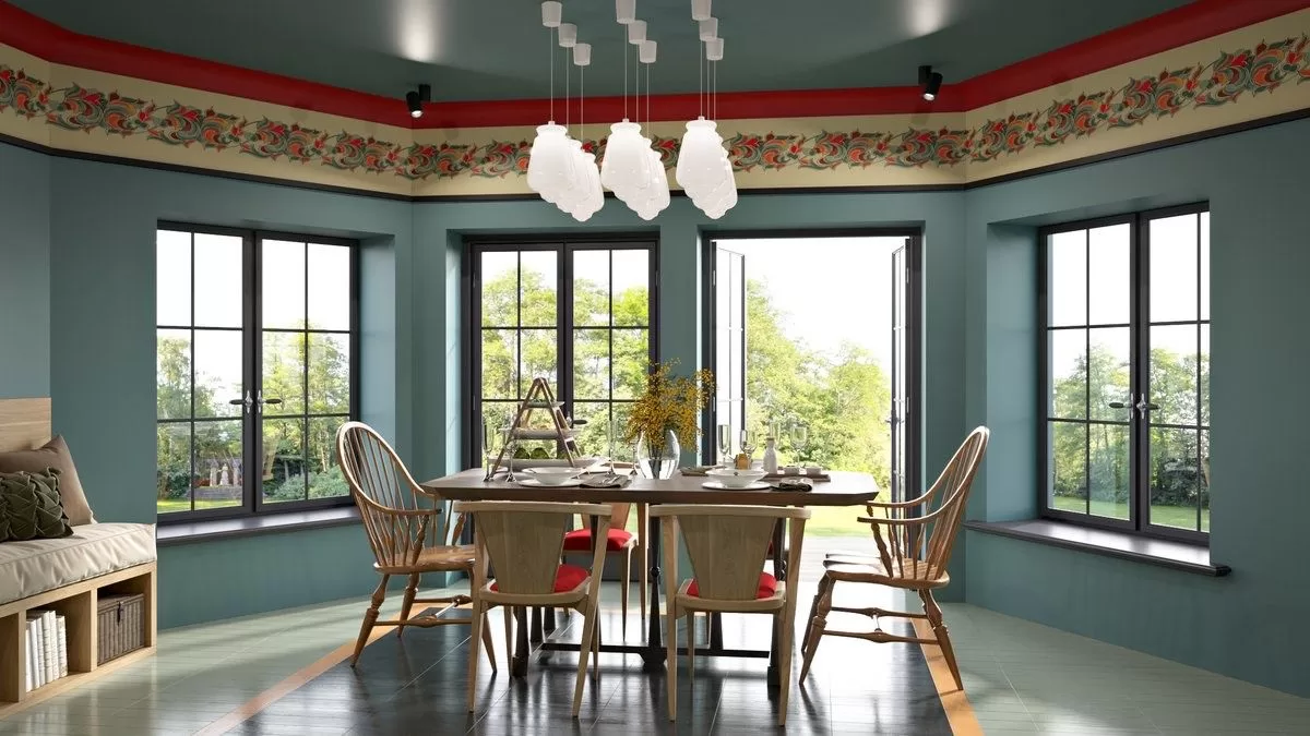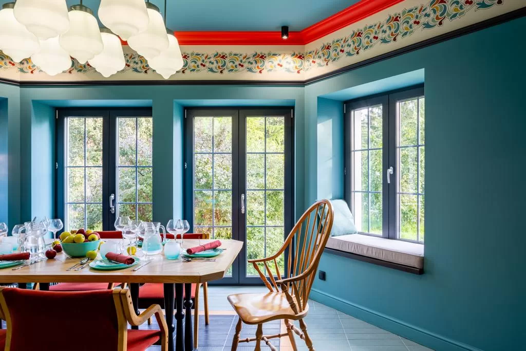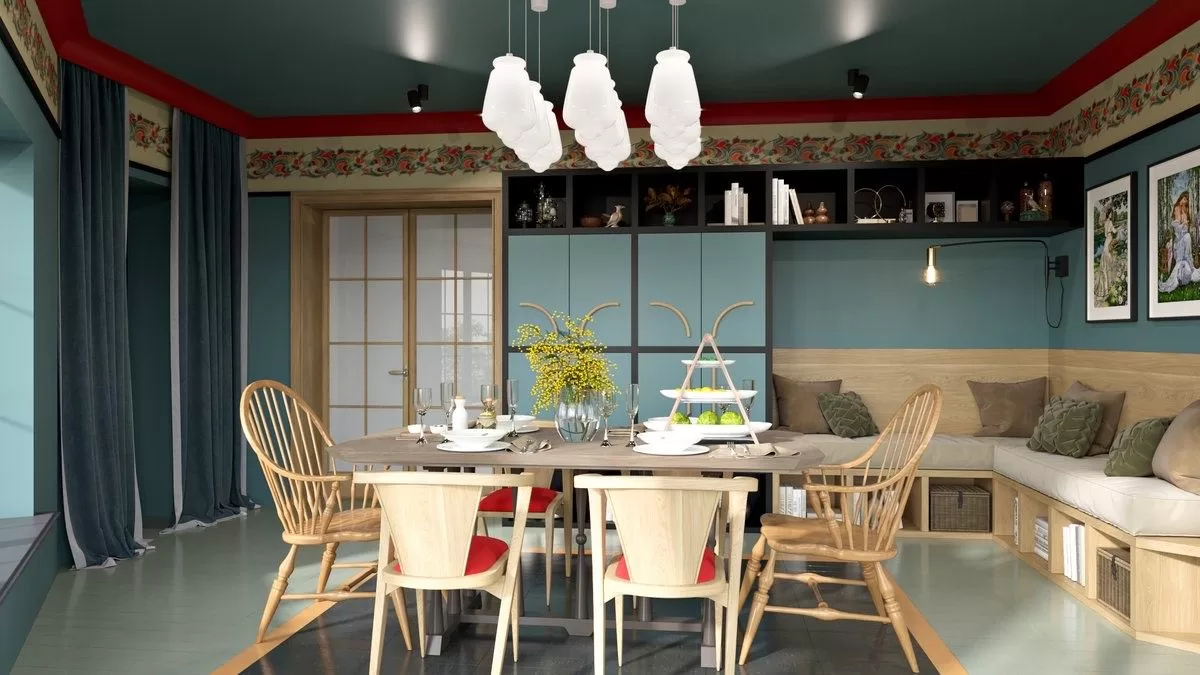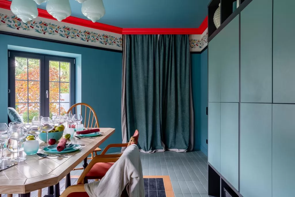 Дизайнер-декоратор Жанна Бадальян с первого взгляда распознала потенциал, скрывающийся в невзрачной комнате площадью 18,3 кв. м. Соседство с кухней и огромной, но пока еще не отремонтированной гостиной, а также возможность организовать выход в сад, делало пристройку идеальным вариантом для обустройства в ней большой столовой. С помощью изменения конструкции окон в помещение ворвался поток естественного света. Два окна переделали в распашные двери, ведущие в сад, а два других увеличили. Толстые стены позволили превратить подоконники в сидячие места, которые добавили уюта комнате и развлечений хозяйскому коту, который теперь дни напролет оттуда наблюдает за птицами в саду. Вход из гостиной расширили и установили двойную парадную дверь. Замурованный прежними владельцами проем между кухней и пристройкой по просьбе хозяйки превратили в полноценный проход. Теперь носить еду из кухни и сервировать стол станет намного быстрей и удобней. Проход задекорировали портьерами в цвет стен, при необходимости их легко можно открыть и закрыть.