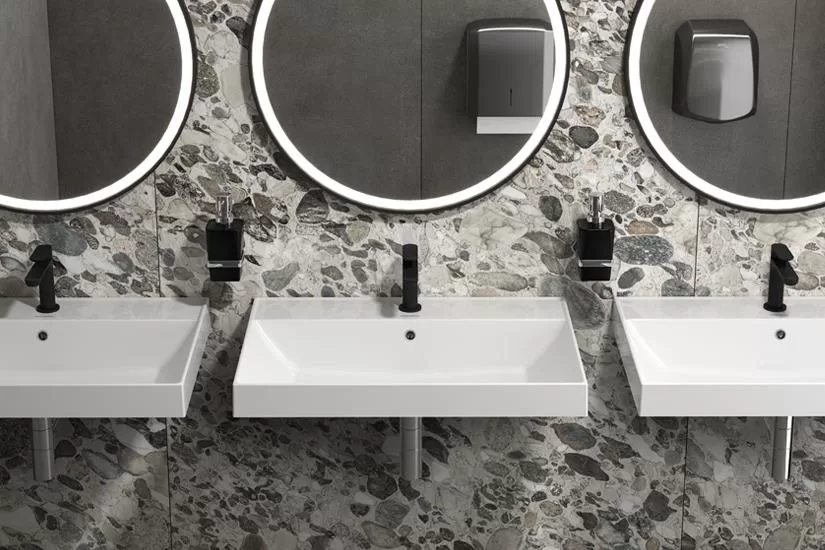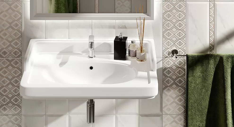 зеркал KERAMA MARAZZI, выбрать подходящий смеситель (хромированный или чёрный), дополнить навесным пеналом и держателем для полотенца.