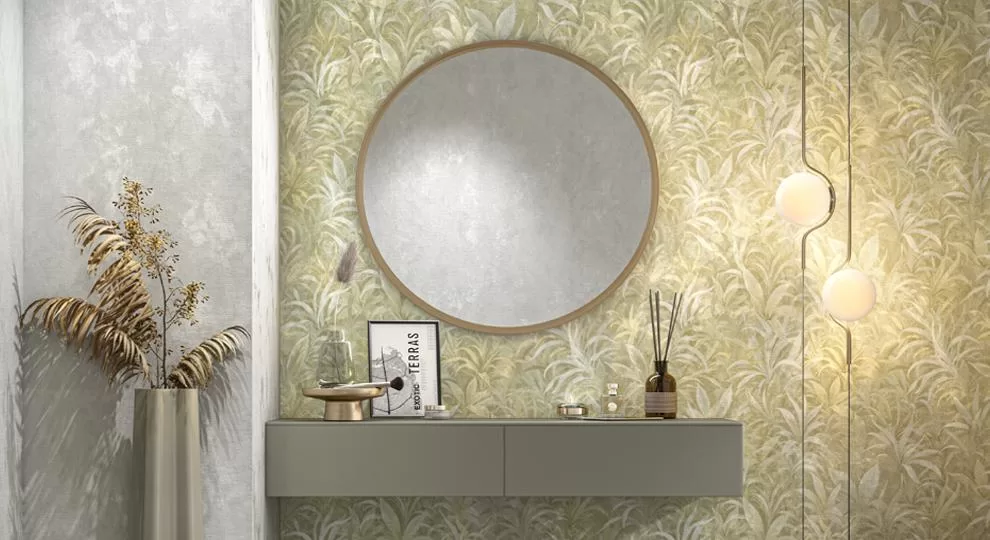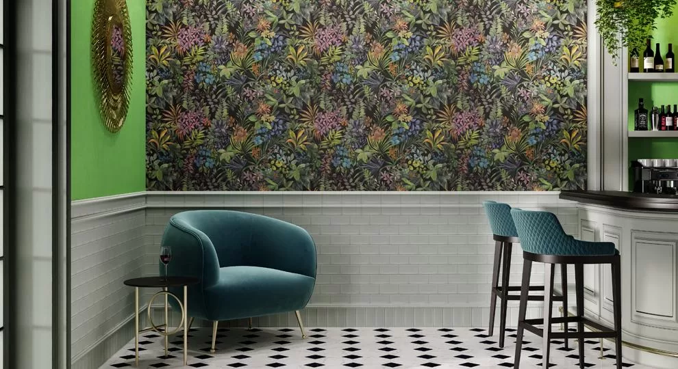 Обои с природным рисунком в интерьере можно совмещать с разными видами покрытий, в том числе с керамической плиткой. Подобрать удачное сочетание отделочных материалов можно, опираясь на дизайн помещения: напомним, что его эскиз вам готовы сделать в любом из фирменных магазинов KERAMA MARAZZI.