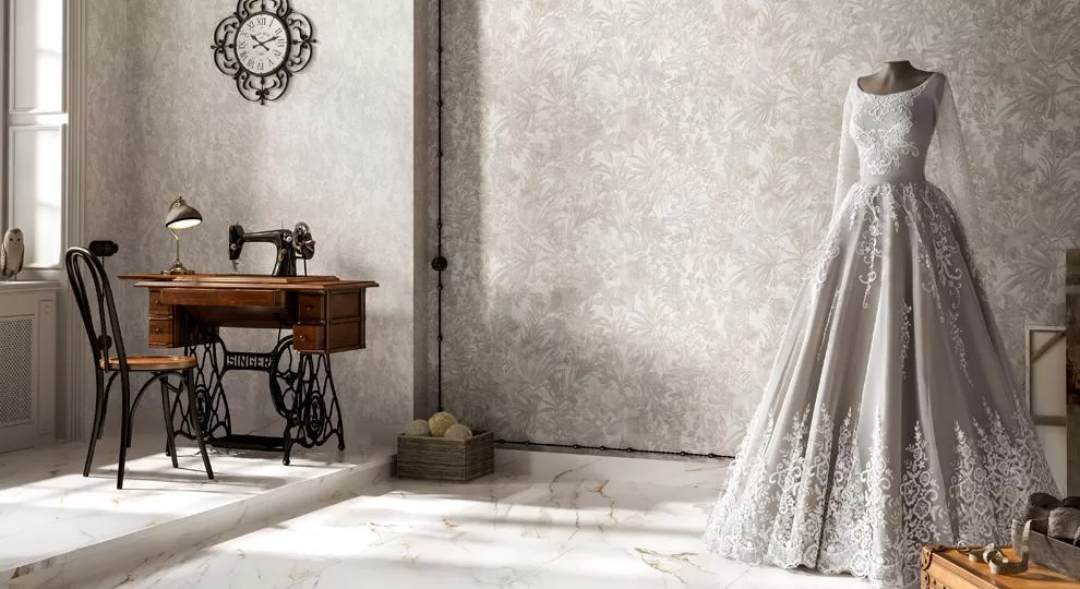 Дизайн обоев «Флора» по духу близок к классике. Поверхность украшена орнаментами, воспроизводящими богато расшитую ткань с цветочным кружевом и лёгким блеском драгоценного напыления. Декоративное покрытие золотым и серебряным составом придаёт обоям блеск, привносит интересную игру света.