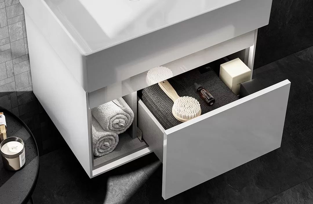 Мебель можно использовать c накладными и встраиваемыми раковинами PLAZA, с керамическими столешницами с эстетикой мрамора. Помимо тумбы, в коллекции предусмотрен высокий пенал с распашной дверцей, также на высоких ножках.