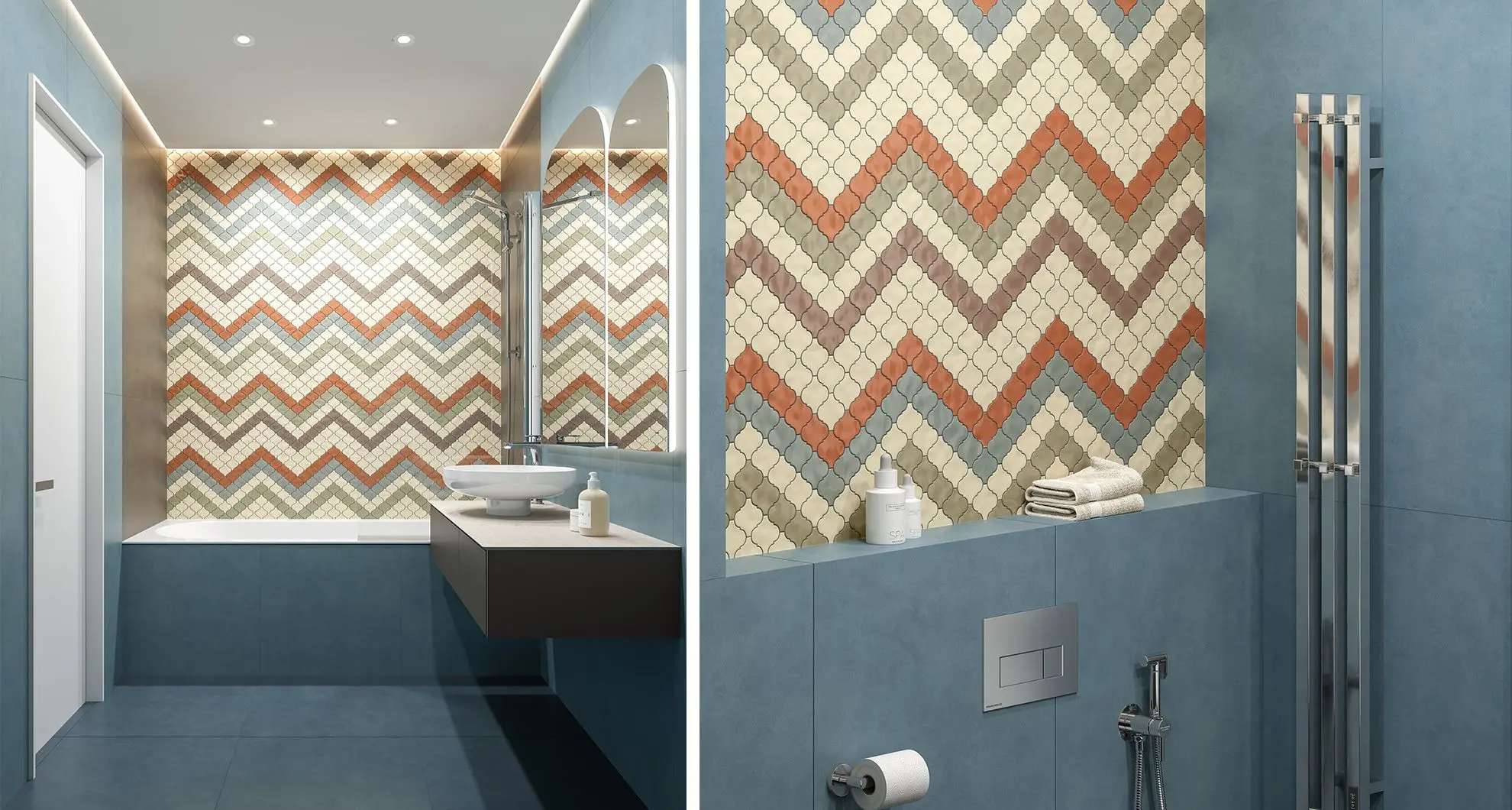 К Новому году особенно популярны решения с металлическим блеском, глубокими оттенками и выразительными узорами. В ванной комнате это может быть керамическая плитка из серий «Ифран», «Агдаль» или «Риад». А серии «Таделакт», «Далия», «Медина» и «Фес» добавят интерьеру восточного шарма и праздничного настроения.