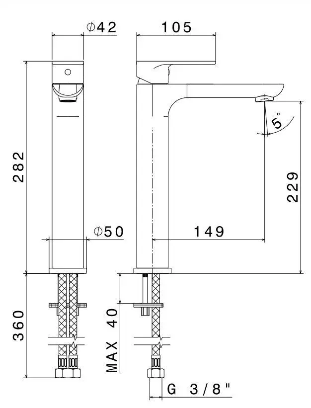 Однорычажный смеситель для раковины, высокий, с установкой на столешницу, без донного клапана. Соединение 3/8”.