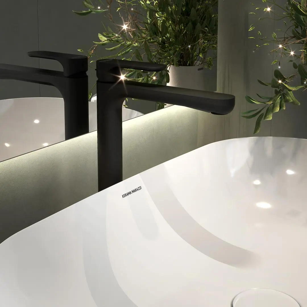 Высокий однорычажный смеситель OLE с обновлённым эргономичным дизайном представлен в трёх цветах (хром, чёрный матовый и золотой атласный). Модель устанавливается на столешницу, предназначена для использования с накладными раковинами KERAMA MARAZZI без отверстия под смеситель. Идеально cочетается со всеми артикулами серии OLE для душа и ванны.
