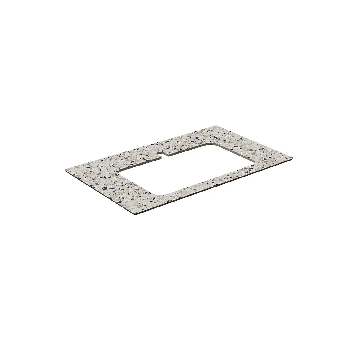 Столешница для тумб Plaza Modern и Plaza Next шириной 80 см выполнена из светлого керамогранита «Бричиола». Подходит для использования с раковиной PLAZA 55, встраиваемой сверху.