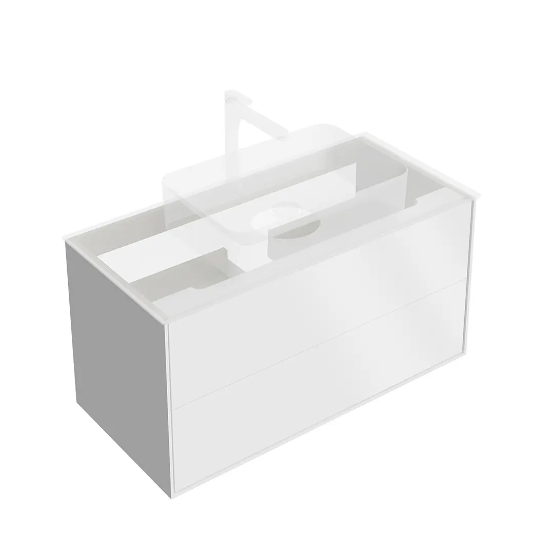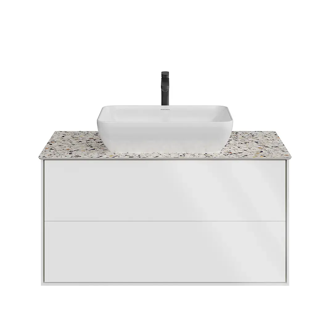 Для данного артикула корпус и фасады решены в белом матовом цвете, внутренняя отделка ящиков — ЛДСП в цвете «Шалфей». Все ящики оснащены системой нажимного открывания. Рекомендуемые смесители от KERAMA MARAZZI: OLE/ОЛЕ, PIANO/ПИАНО, FUTURA/ФУТУРА, ETERNA/ЭТЕРНА.