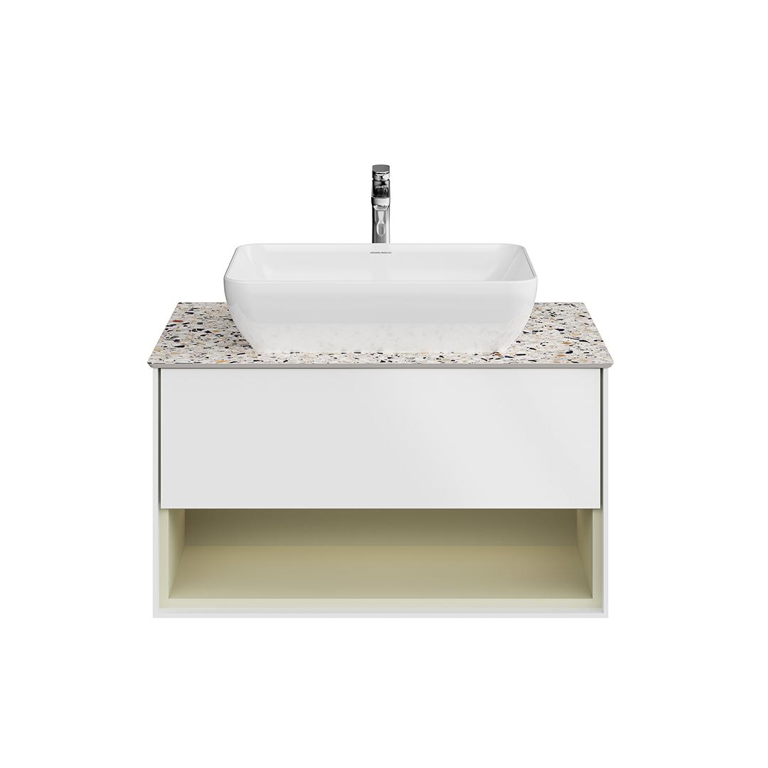 Тумба PLAZA Modern подвесная 80, push, 1 ящик, подсветка, белая матовая+шалфей
