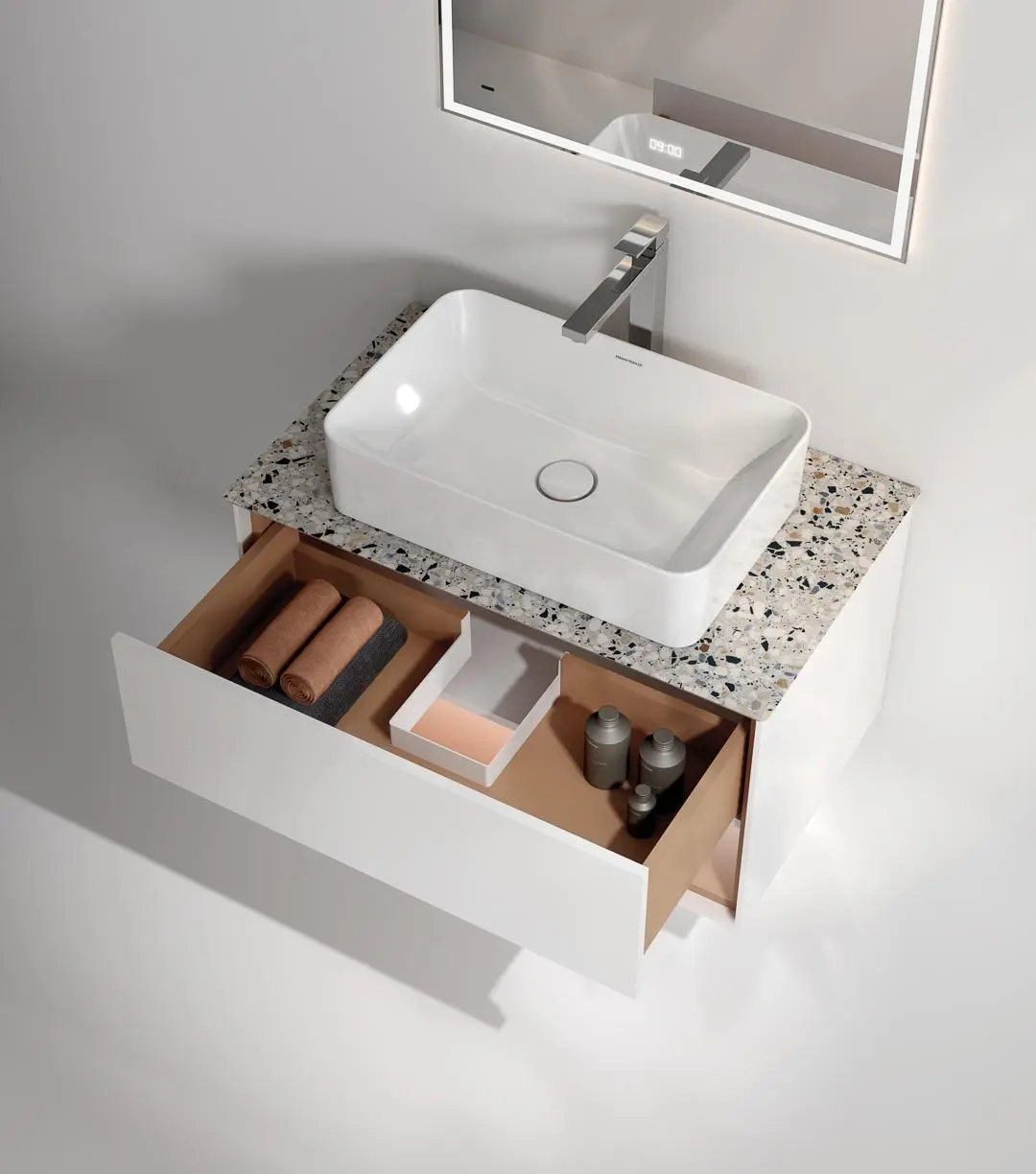 Особое внимание уделено практичности: каждая тумба под раковину продумана до мелочей, обеспечивая удобное хранение и эстетику.