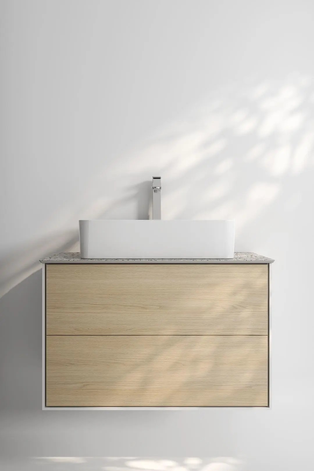 Для данного артикула корпус решен в белом матовом цвете, фасады и внутренняя отделка выполнены в цвете «Дуб Виченца». Все ящики оснащены системой Push to Open. Рекомендуемые смесители от KERAMA MARAZZI: OLE, PIANO, FUTURA, ETERNA.