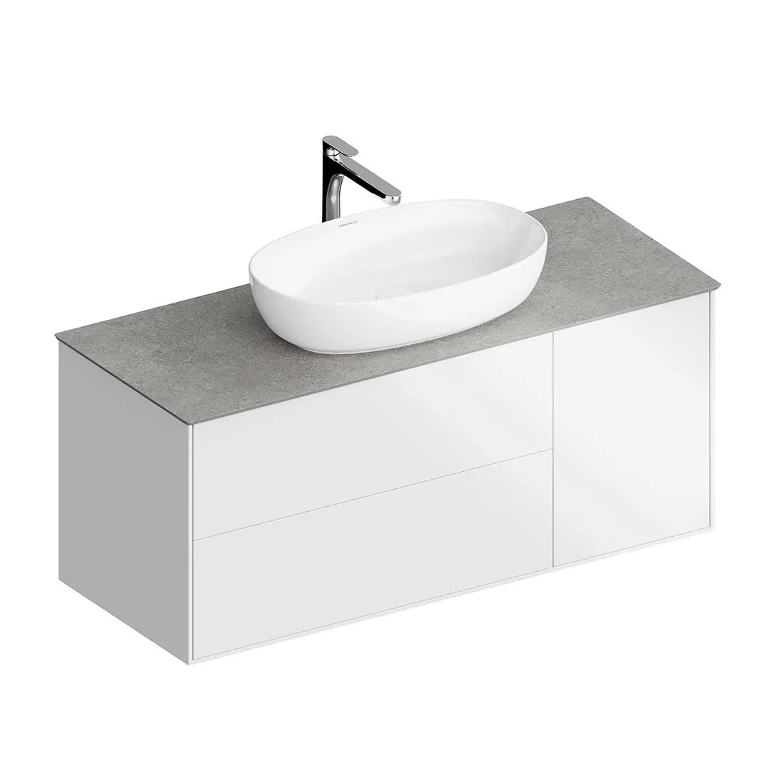 Подвесная тумба в белом глянцевом цвете с тремя выдвижными вместительными ящиками, оснащенными системой открывания Push-to-Open. Сочетается со столешницами PLAZA Modern и накладными раковинами серии PLAZA.