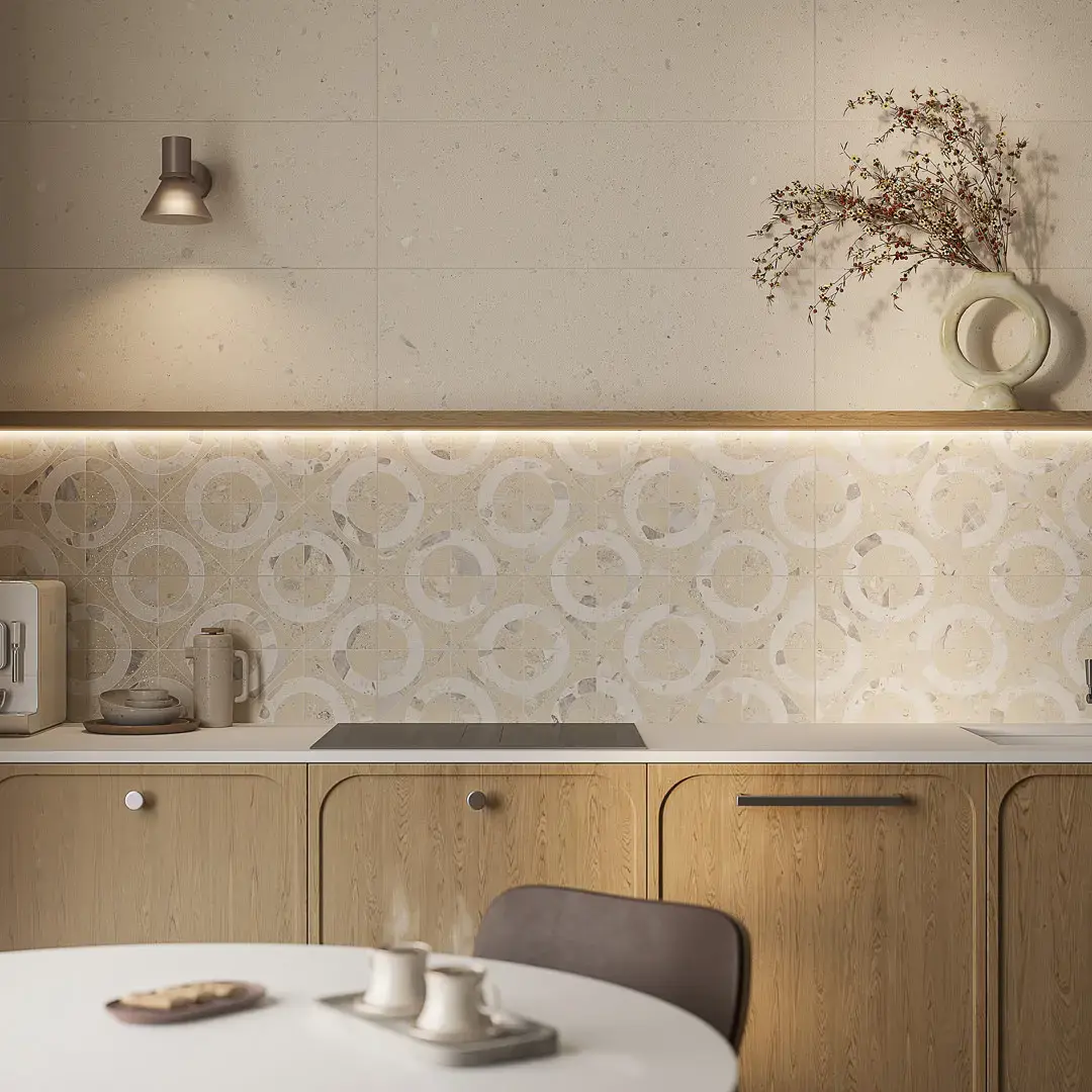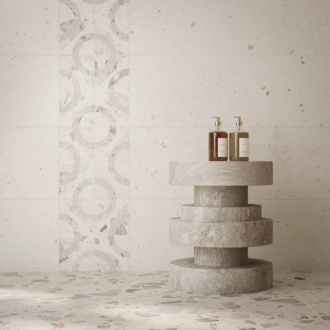 Плитка воспроизводит камень «петра шелл» (pietra shell) — известняк, добываемый из карьеров, особенно богатых мраморными остатками, и содержащий включения разного размера. Они и формируют уникальный характер этого покрытия, применить которое можно и в классической, и в современной обстановке. Представлены варианты графики с более крупными и мелкими включениями. Также в серии есть координированный керамогранит 60×60 под камень и плинтус.
