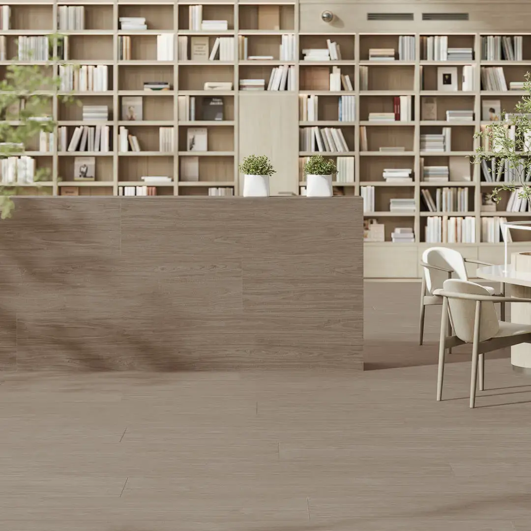 В формате 60×119,5 представлены материалы с увеличенной толщиной 20 мм. Утолщённый керамогранит с эстетикой светлого дуба — отличное решение для пространств, где нужна повышенная стойкость к нагрузкам, при этом важна достоверная природная эстетика.