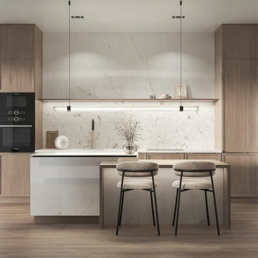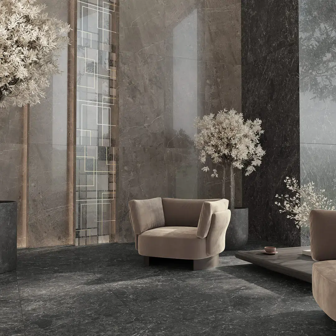 Настенная плитка в формате 60×119,5 предлагается в нескольких вариантах: светлые рисунки мрамора на гладкой плитке, светлые артикулы со структурой рейки и тёмные рисунки мрамора с гладкой поверхностью. Декор 60×119,5 предлагает стильный микс из трёх темных рисунков, помогая объединить в интерьере все три воспроизведения.