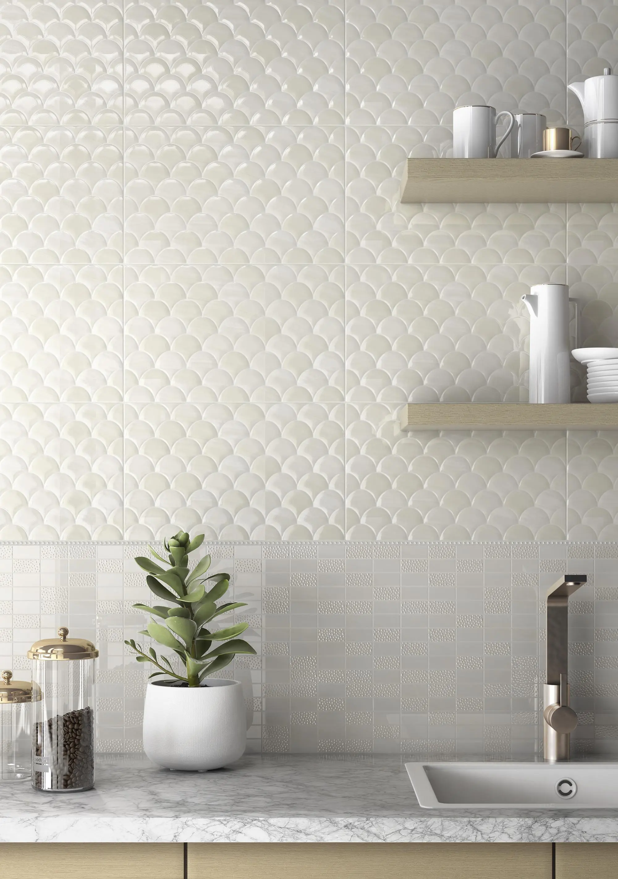 За основу серии взяты три прохладных оттенка оникса, выполненные в двух видах структуры – гладкой и рельефной, напоминающей черепицу. Объемные декоры, украшенные россыпью перламутровых «капель», походят на листья кувшинок или чешую диковинной рыбы. Такие же капли можно заметить и на поверхности нарезной мозаики.