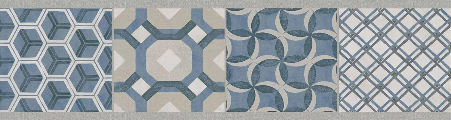 Светлый и синий пэчворк напоминают фрагменты традиционной португальской мозаики «кальсада португеза». Её узоры переосмыслены дизайнерами, и, помимо этнических мотивов, содержат простые геометрические и цветочные рисунки, делая лоскутную композицию универсальной. Декоры обработаны особым составом, создающим эффект акварельной живописи с мягкими контурами.