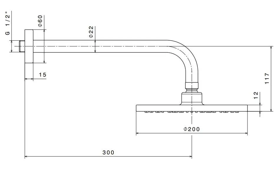 Латунная верхняя круглая душевая лейка «тропический дождь» с кронштейном и выводом из стены, диаметр 200 мм.