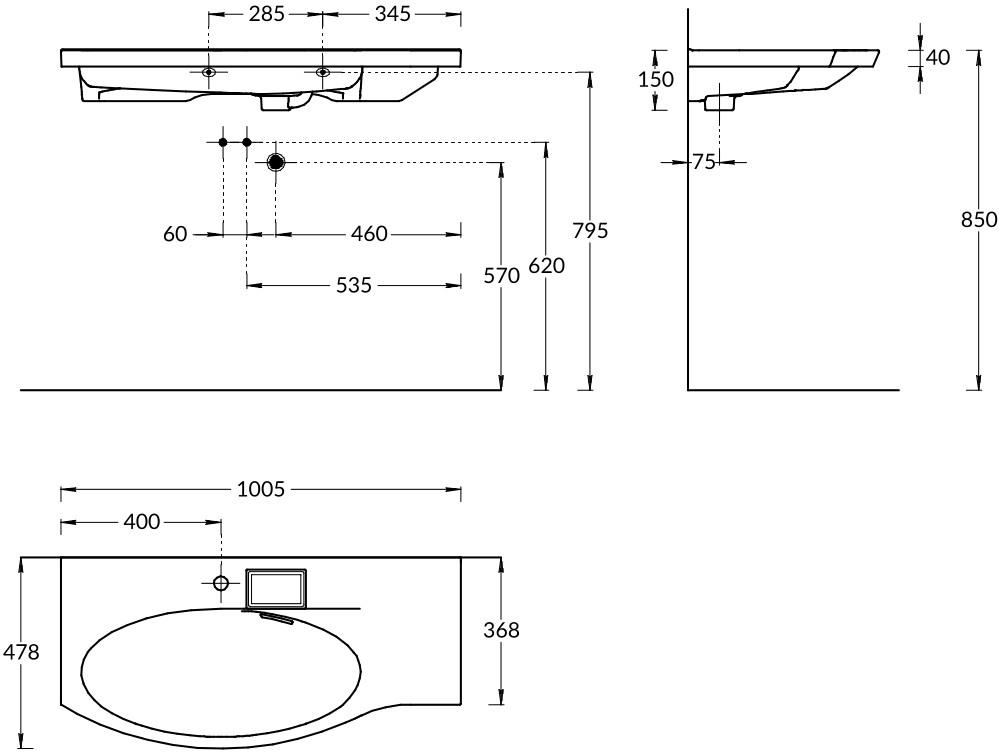 Изогнутая мебельная раковина без необходимости использования донного клапана, ширина 100 см. Отверстие слив\перелив спрятано в небольшой бокс, закрытый керамической крышкой с бортиком. Чаша раковины расположена слева. Сочетается с тумбой Riva/Рива.