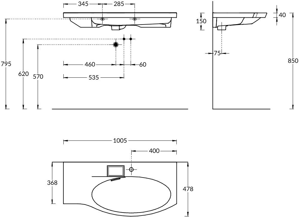 Изогнутая мебельная раковина без необходимости использования донного клапана, ширина 100 см. Отверстие слив\перелив спрятано в небольшой бокс, закрытый керамической крышкой с бортиком. Чаша раковины расположена справа. Сочетается с тумбой Riva/Рива.