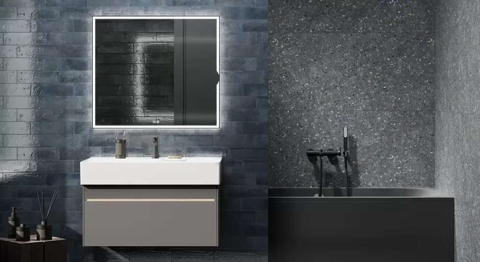 TECNO лёгким движением руки можно менять температуру освещения. Среди других преимуществ TECNO — косметическая линза в варианте зеркала шириной 90 см, активная функция «антизапотевание» и дисплей с часами в нижней части зеркальной поверхности.