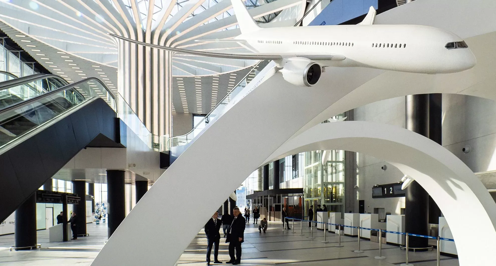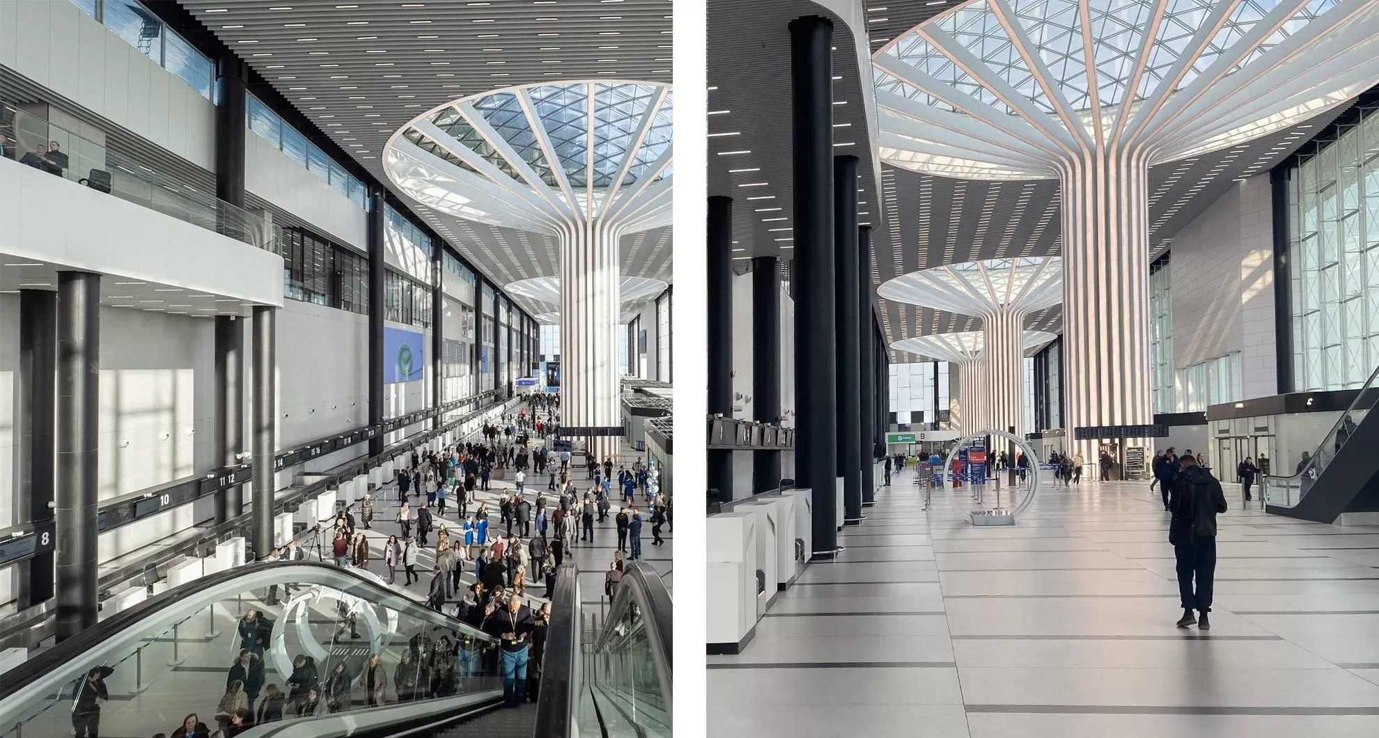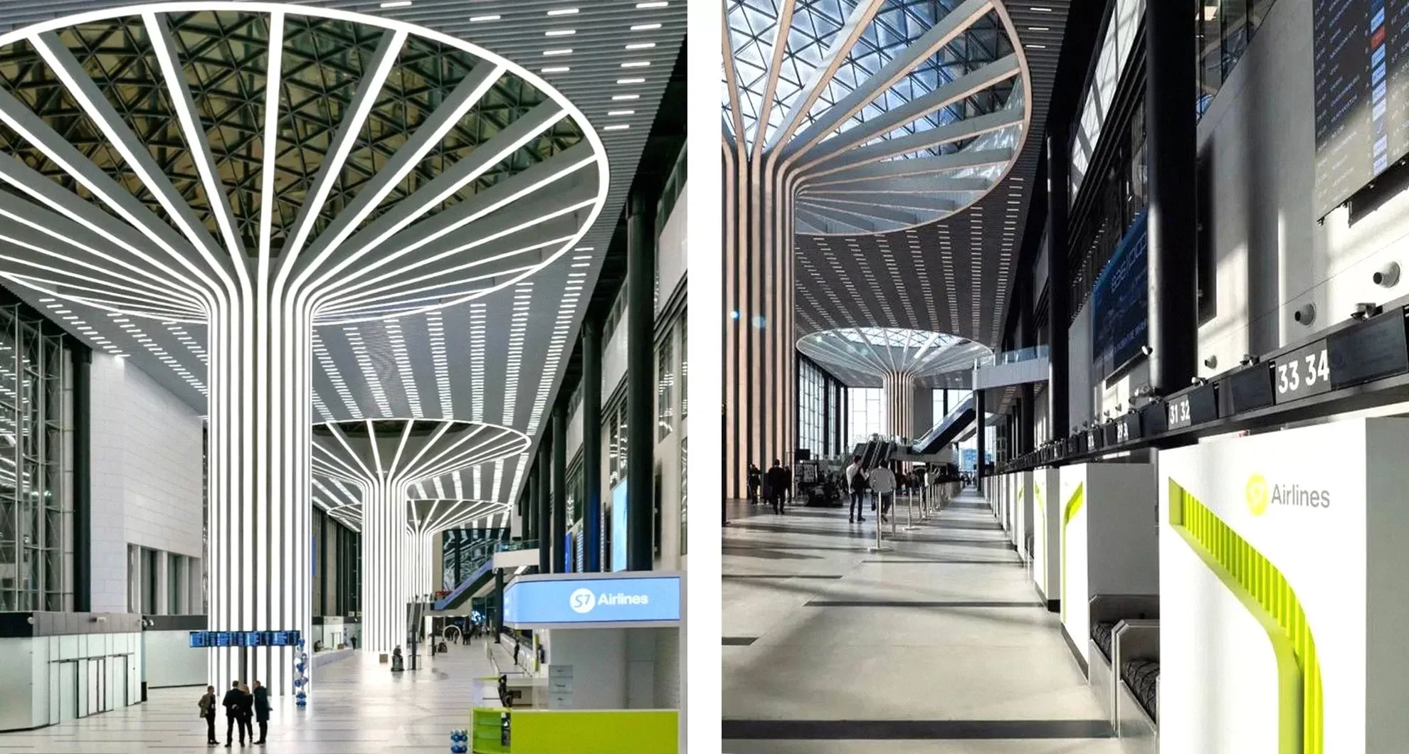 Интерьер нового терминала, где высота потолков достигает 30 метров, предлагает открытые просторные площади и непрерывные однотонные поверхности. Центральным элементом оформления стали четыре внутренние колонны, напоминающие гигантские деревья из отдельных направляющих, устремленных в небо и «разлетающихся» под потолком во всех направлениях.