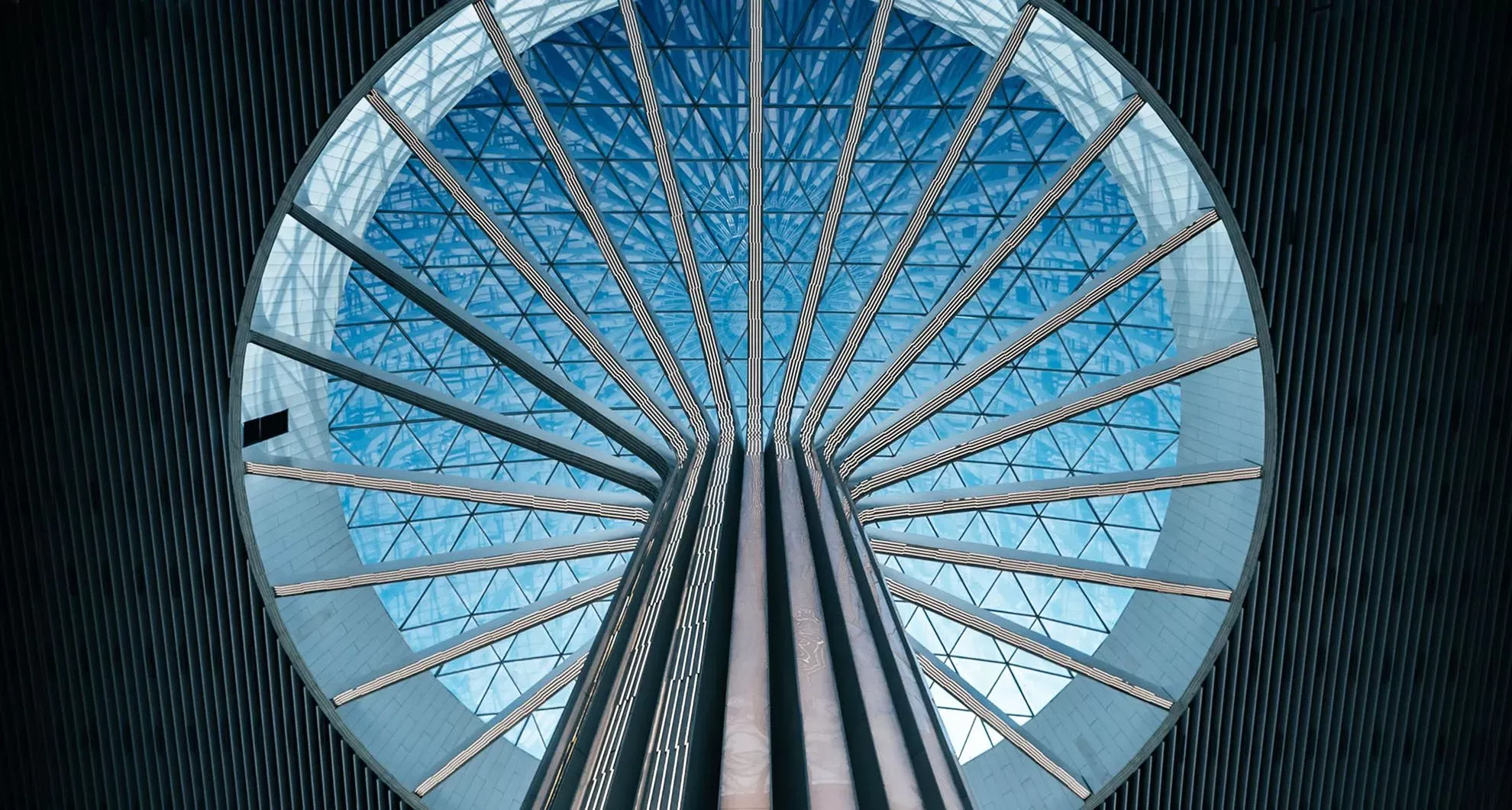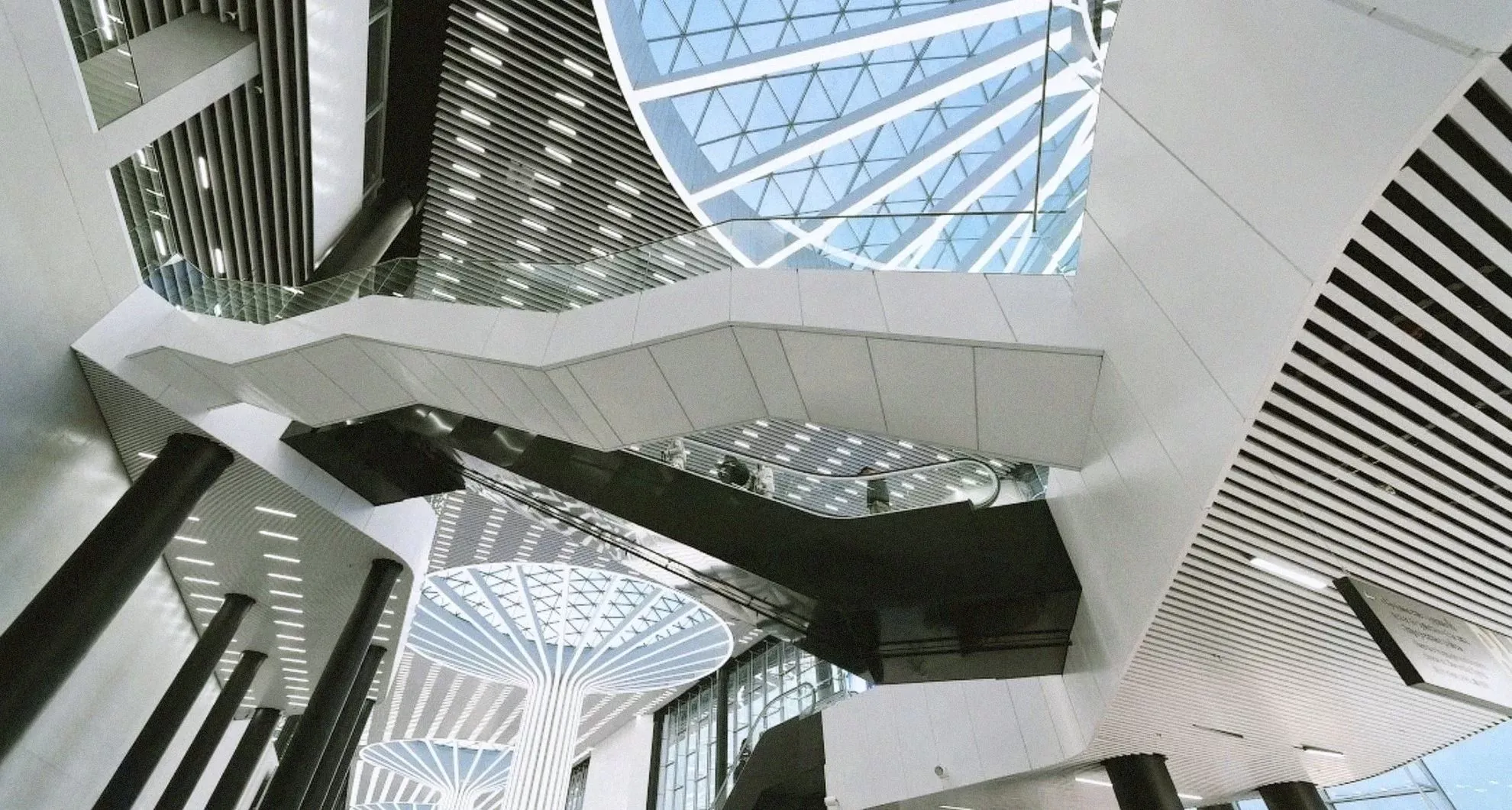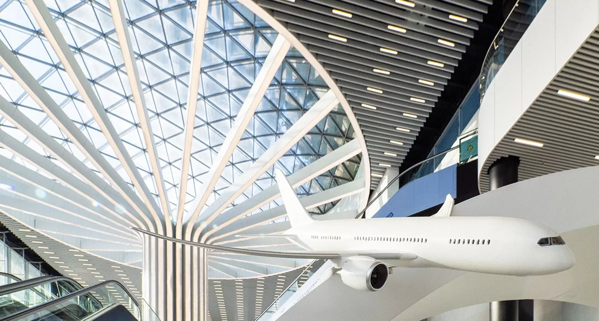 Интерьер нового терминала, где высота потолков достигает 30 метров, предлагает открытые просторные площади и непрерывные однотонные поверхности. Центральным элементом оформления стали четыре внутренние колонны, напоминающие гигантские деревья из отдельных направляющих, устремленных в небо и «разлетающихся» под потолком во всех направлениях.