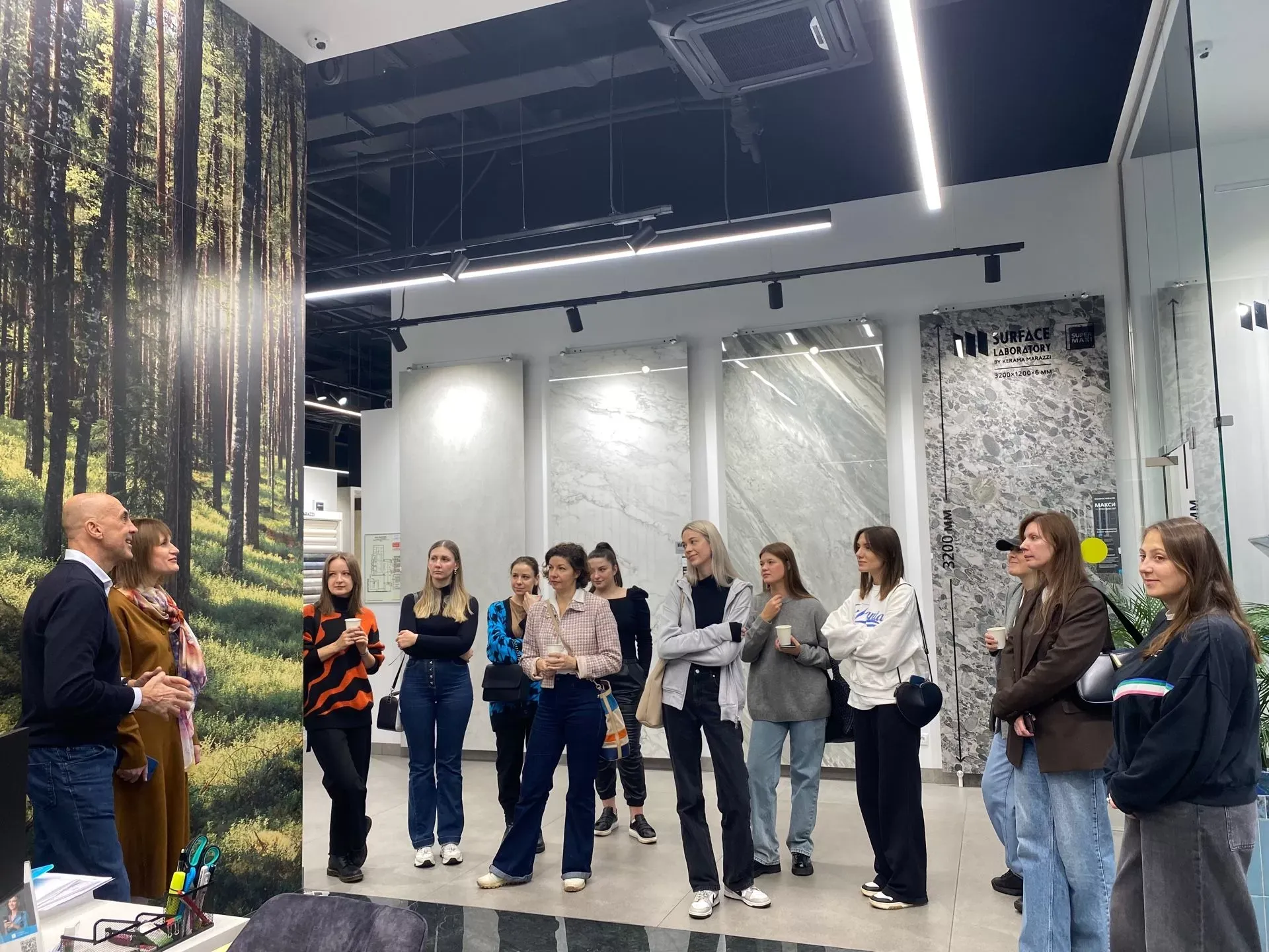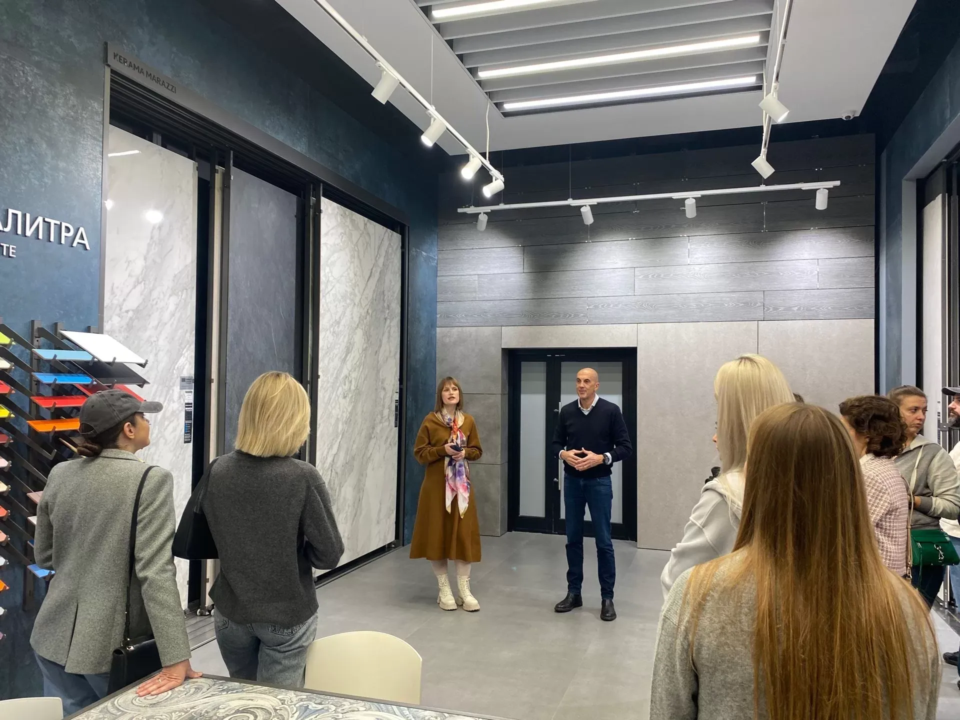 Гостей встретили директор по работе с проектами Альберто Фаварон и менеджер проектного отдела Наталья Рашковская. Они рассказали о компании KERAMA MARAZZI, её истории и продукции, познакомили с разными форматами плитки и керамического гранита, показали интерьерные кабины, где представлены и