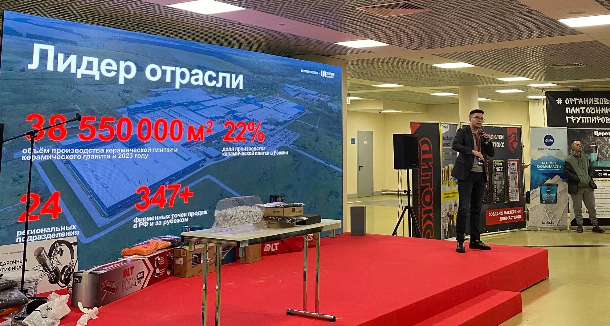 Спикер Эмиль Намазов, специалист по развитию и продвижению бренда Surface Laboratory, провёл презентацию и продемонстрировал наиболее яркие реализованные проекты с использованием сверхкрупных форматов керамического гранита и персонализации. В чём его преимущества? Каким он бывает? Как работать с таким форматом? Где производится МАКСИ и СУПЕРМАКСИ-форматы керамогранита? Гости получили ответы на эти и другие вопросы. В завершении своего выступления Эмиль с коллегами из KERAMA MARAZZI выбрал победителя розыгрыша среди зарегистрировавшихся на нашем стенде. Он стал обладателем сертификата OZON на сумму 25 тысяч рублей.