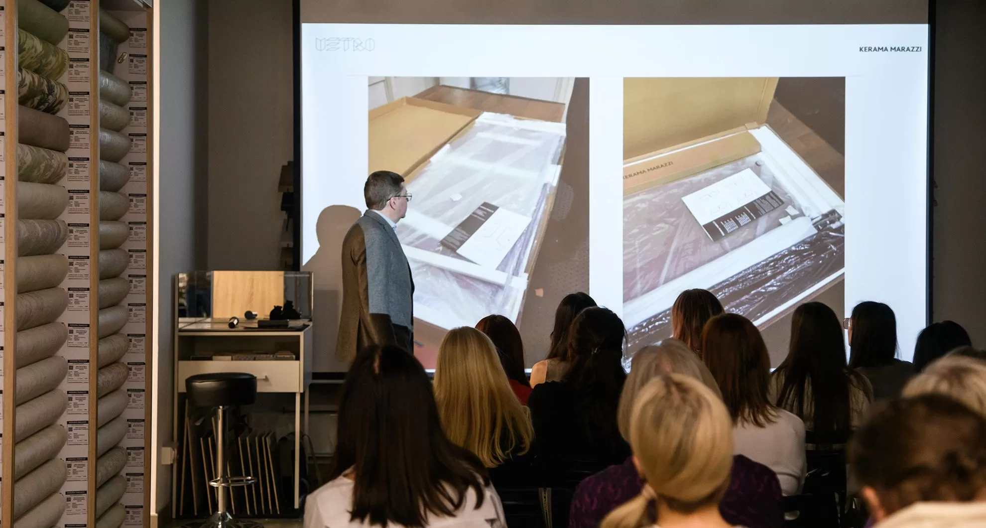Директор направления Ванная комната KERAMA MARAZZI Массимо Санти и его помощница Карина Бараева поделились тем, как работать с клиентами и как грамотно рассказывать о сериях сантехники и мебели KERAMA MARAZZI. Менеджер Фёдор Михейкин провёл обучение по коллекции душевых ограждений.