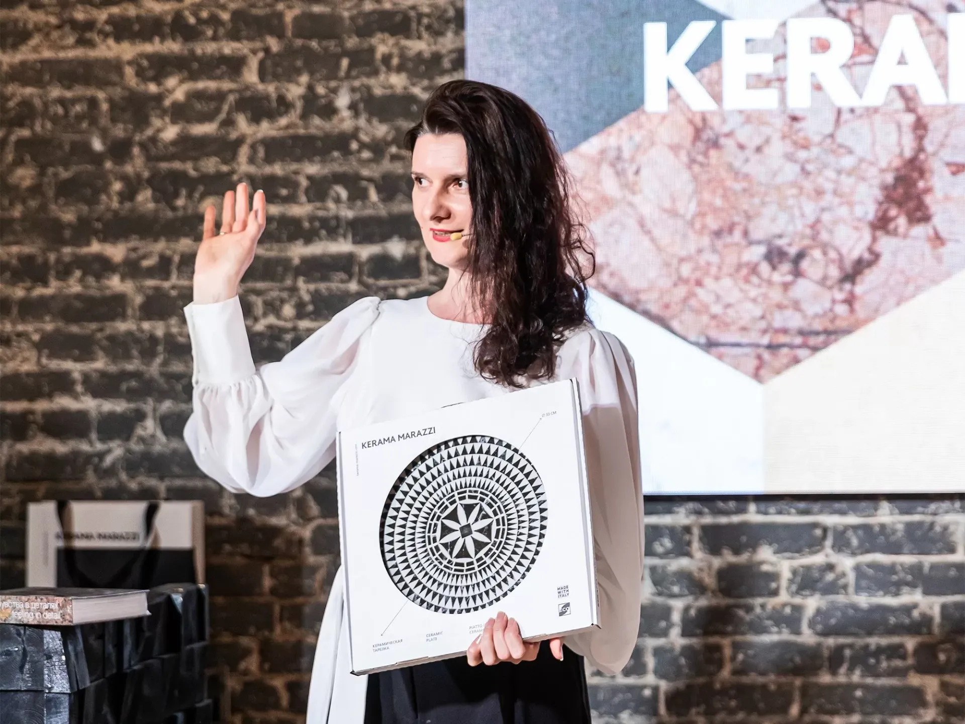 новая коллекция Venezia, объединившая все направления деятельности компании, мы провели торжественную церемонию награждения победителей и призёров Гран-при 2023. Специально к этому мероприятию наши коллеги на орловском заводе изготовили керамические декоративные тарелки, дизайн которых полностью повторяет рисунок одной из серий керамической плитки — эксклюзив для наших победителей. Церемонию награждения вела Ольга Михеева, директор по внешним и внутренним коммуникациям KERAMA MARAZZI.