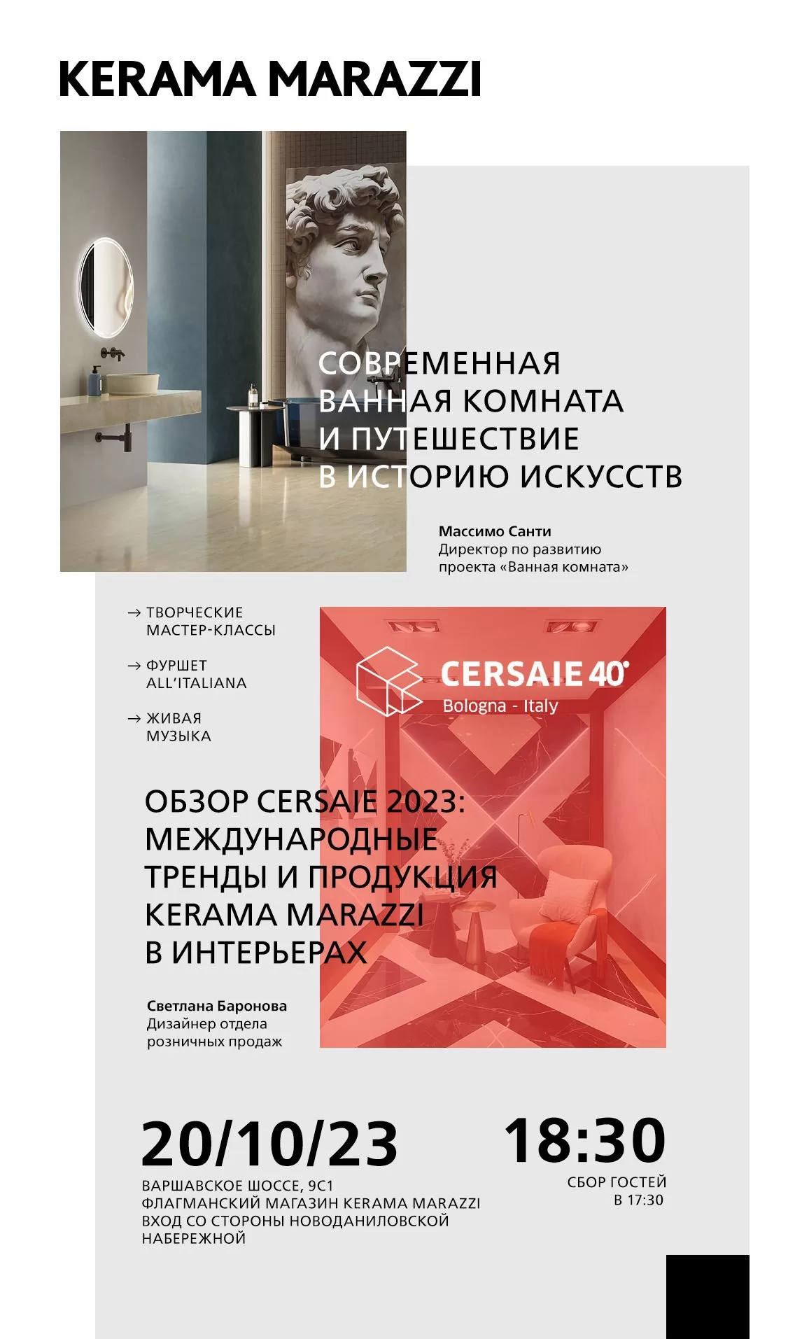 Совсем скоро, 20 октября, во флагманском магазине KERAMA MARAZZI пройдёт презентация «Обзор выставки Cersaie-2023: международные тренды и продукция KERAMA MARAZZI в интерьерах». По следам недавней выставки, прошедшей в Италии, дизайнер отдела розничных продаж Светлана Баронова расскажет о трендах в области керамических материалов и о тенденциях в мире дизайна интерьеров.