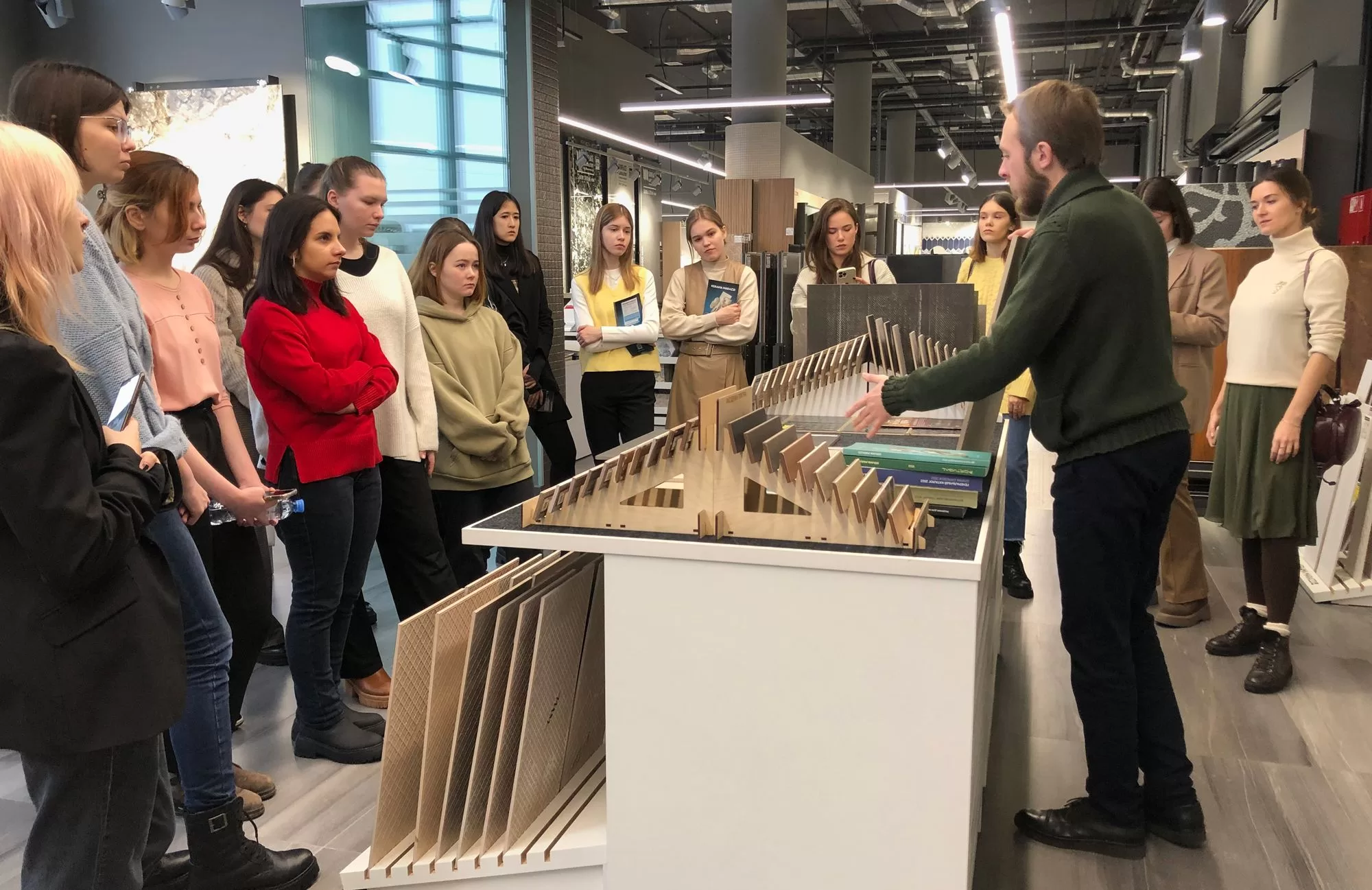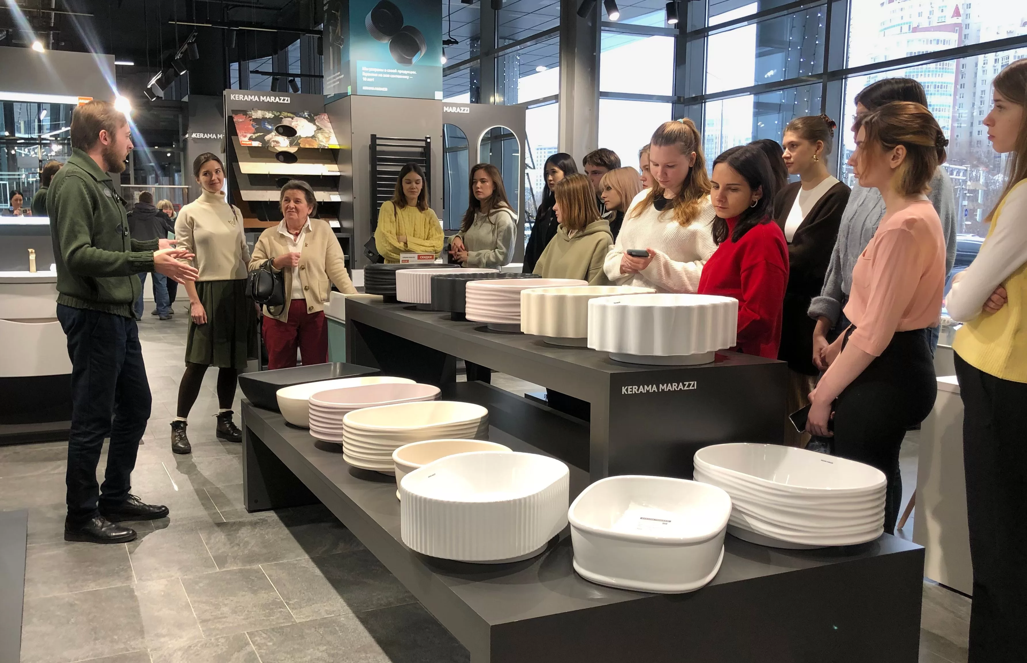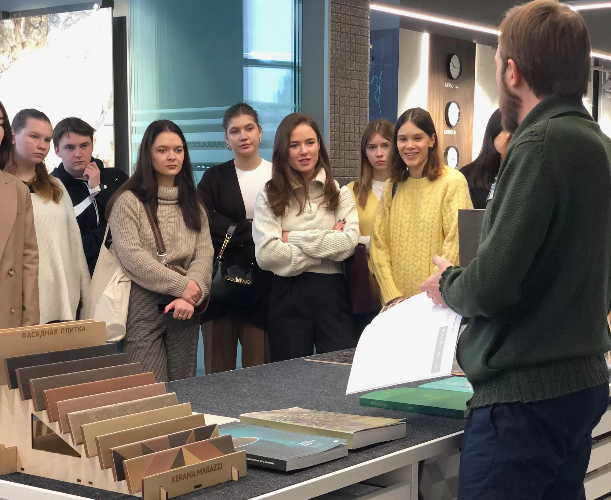 На вопросы о том, какие параметры нужно учитывать при разработке проекта, как ведёт себя материал на разных по масштабам объектах, ответил Александр Парфёнов, менеджер по работе с дизайнерами и архитекторами. Студенты активно интересовались техническими параметрами керамической плитки и керамогранита. Теперь они знают всё о свойствах и практичности этих незаменимых отделочных материалов.