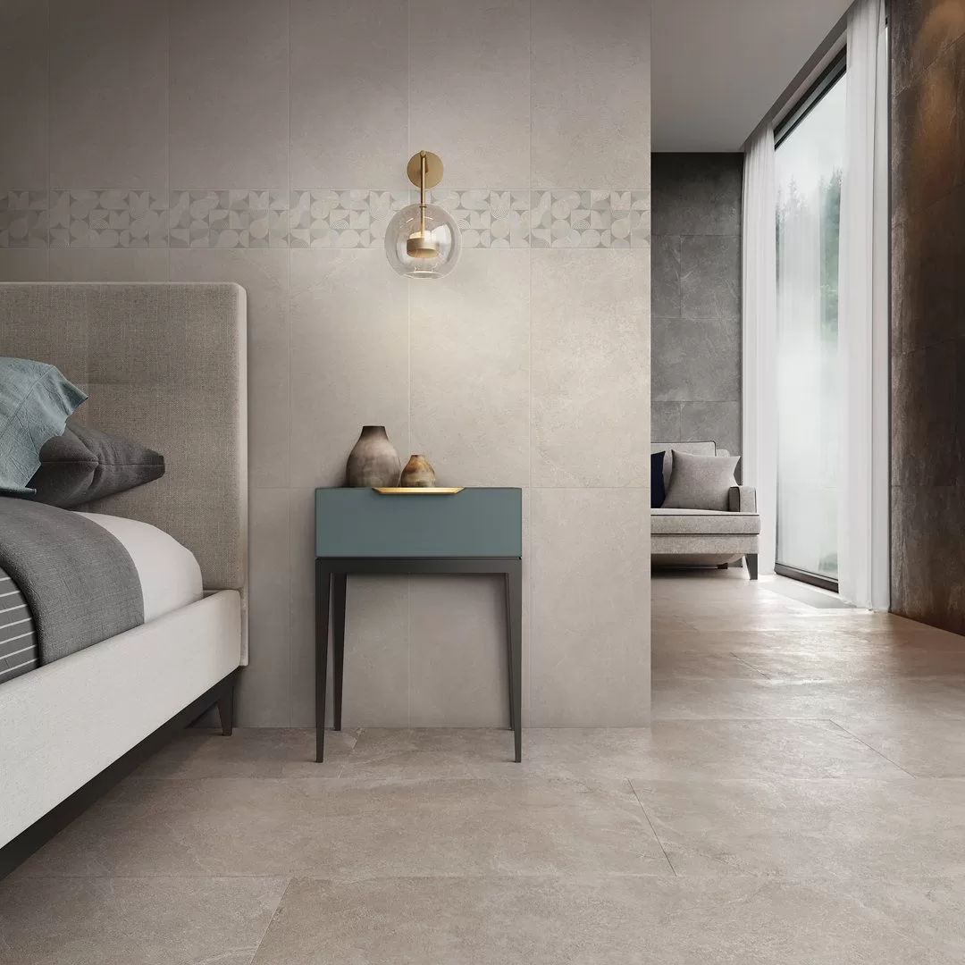 Чтобы сделать керамическую композицию более оригинальной и индивидуальной, в серии предусмотрено несколько декоративных элементов с геометрическим рисунком. Бордюр 60×14,5 см, его укороченная вариация 30×14,5 см, а также квадратная вставка 14,5×14,5 см выполнены с применением материалов, придающих объём отдельным элементам графики. По цвету и структуре серия отлично дополняет напольный керамический гранит с эстетикой камня, представленный в ассортименте KERAMA MARAZZI.