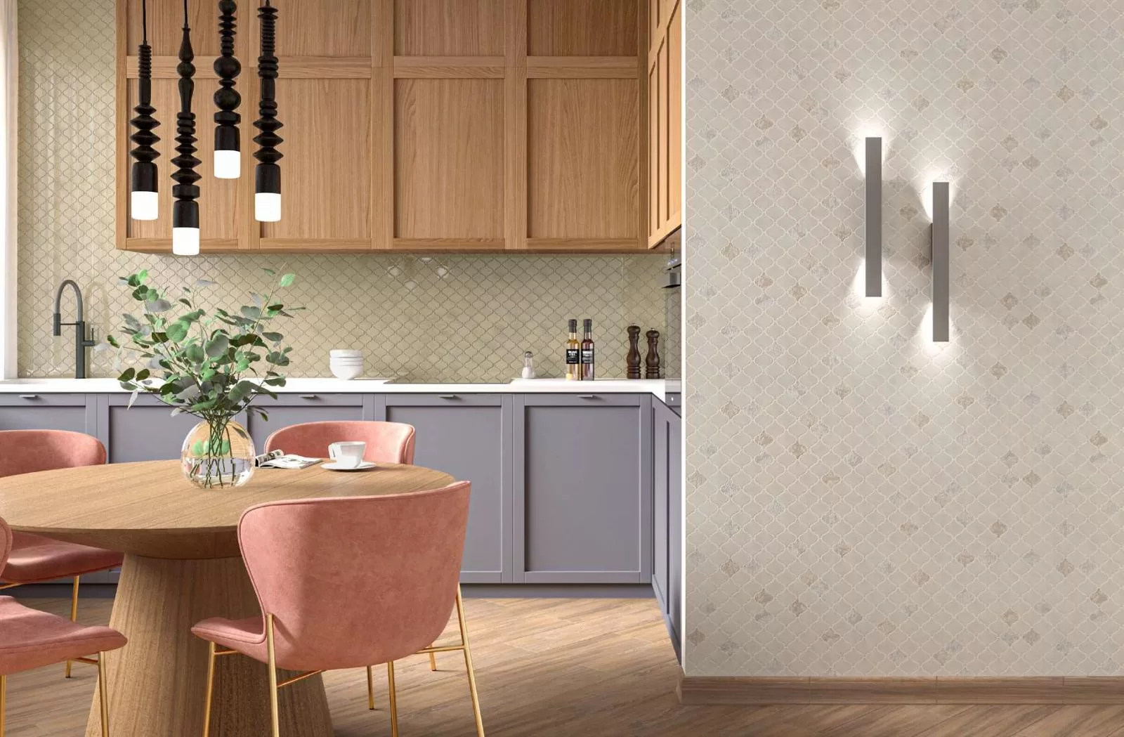 Арабески, заслужившие любовь в керамической мозаике, теперь доступны и в варианте обоев. В некоторых элементах узора заметен эффект кракле – краска словно потрескалась от времени.