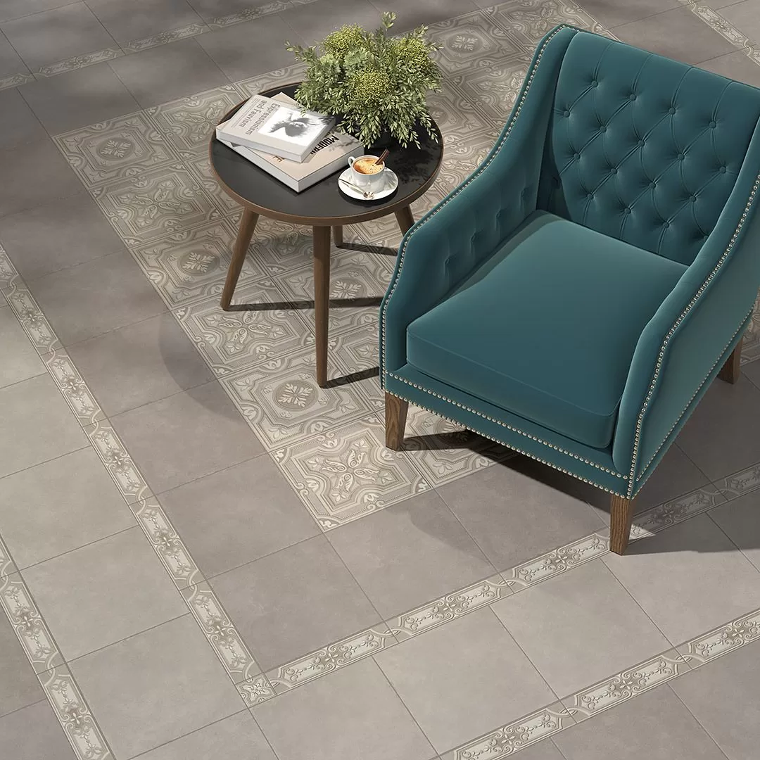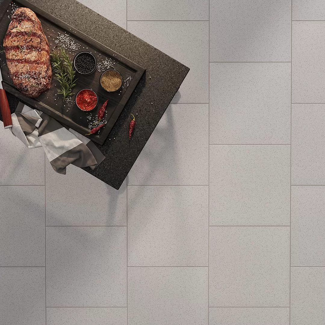 «Специи». Рисунок такой плитки часто называют «соль-перец» за мелкие вкрапления, как будто рассыпанные по бетонной поверхности. Благодаря характерному рисунку, легко скрадывающему любые загрязнения, удобному формату 30×30 и износостойкости керамогранита такое универсальное покрытие широко используется при отделке производственных и торговых помещений. Новые артикулы