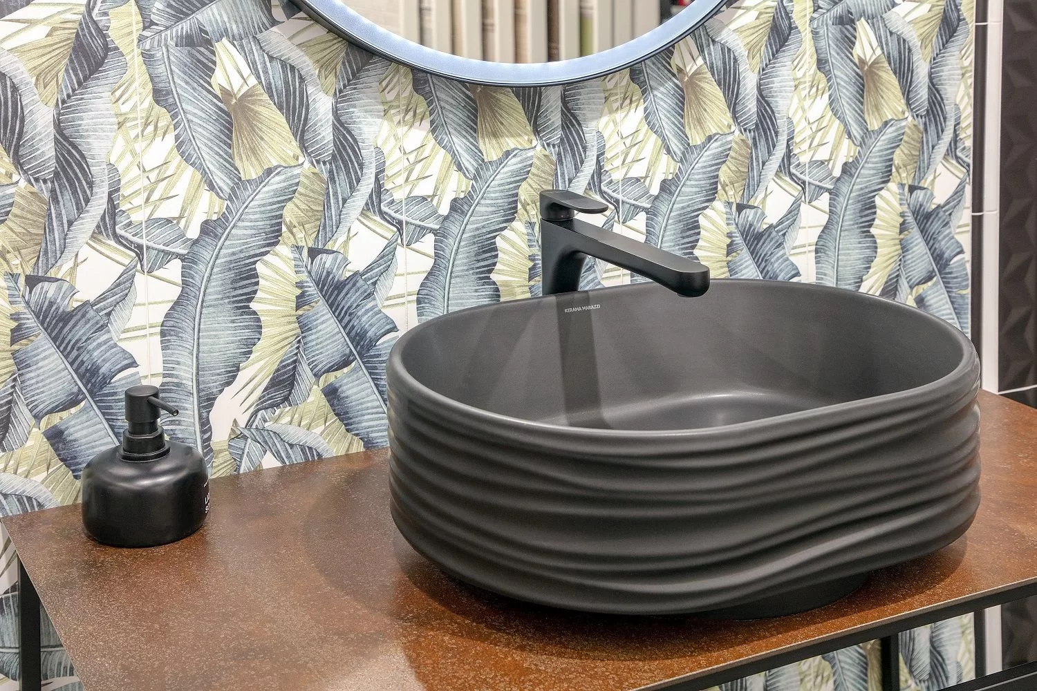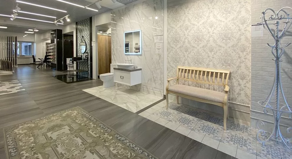 Просторный торговый зал площадью 370 кв.м. вместил в себя широкий ассортимент керамической плитки, керамического гранита, мозаики, обоев, санкерамики и мебели для ванной комнаты.