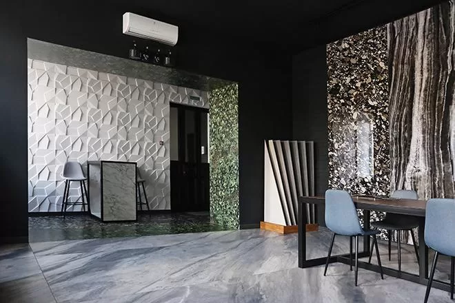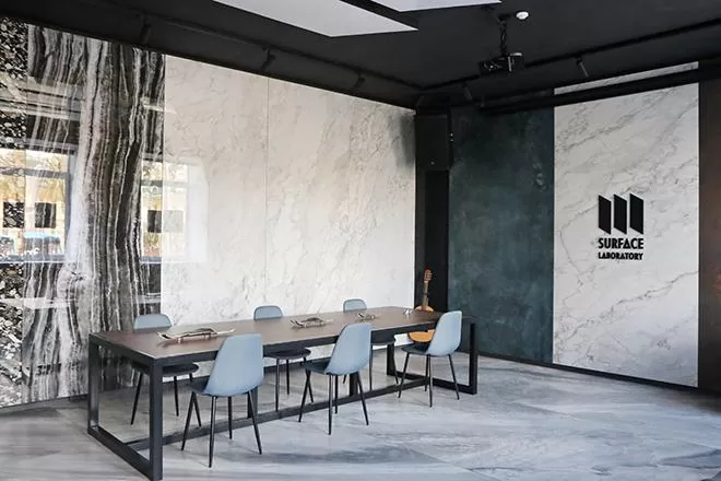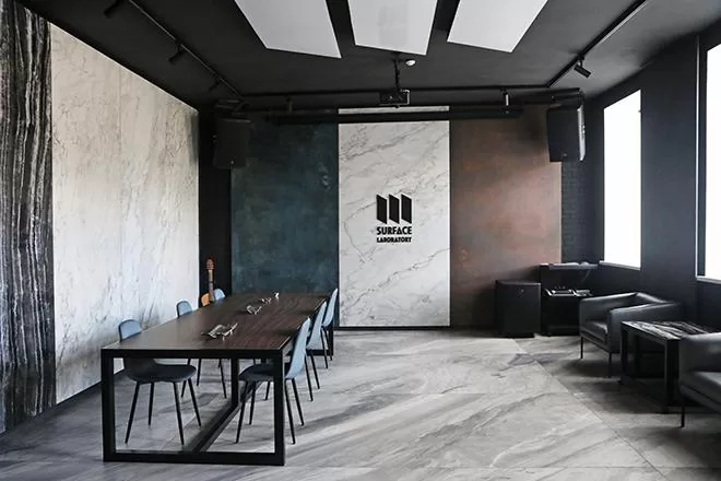 Шоу-рум Surface Lab – это отличная возможность познакомиться с керамическим гранитом сверхкрупного формата в интерьере. Стены, пол и даже потолок здесь выполнены из суперМАКСИ-материала. Этот продукт уникален для российского рынка и даёт поистине неограниченные возможности при отделке интерьеров и фасадов зданий, в том числе позволяя создать персонализированный дизайн для неповторимого облика архитектурных проектов.