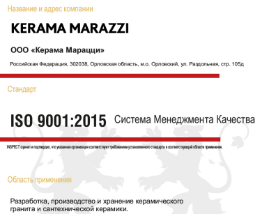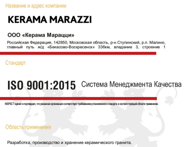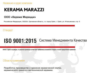 Все три производственные площадки KERAMA MARAZZI успешно прошли аудит, подтверждающий соответствие наших фабрик требованиям стандарта ISO 9001:2015.